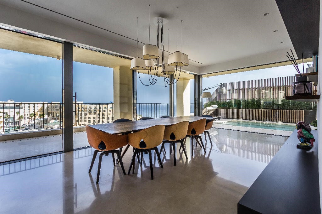 The penthouse opens into a wide entrance hall that immediately conveys its sense of scale. The layout has been thoughtfully designed to separate the main entertaining areas from the private sleeping quarters. At the heart of the home is a bright open-plan living and dining room, framed by full-height apertures that lead directly onto the impressive north-facing front terrace. Here, panoramic views stretch across the yacht marina and out to the Mediterranean, forming a striking and ever-changing backdrop.