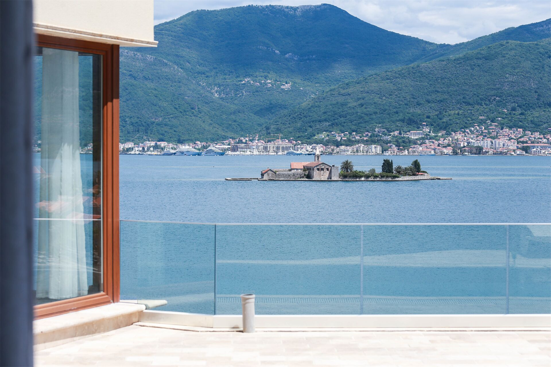 The villa features an inside atrium, spacious and light living spaces, three open terraces and breath-taking views over Tivat bay and the Island of Sveti Marko.
